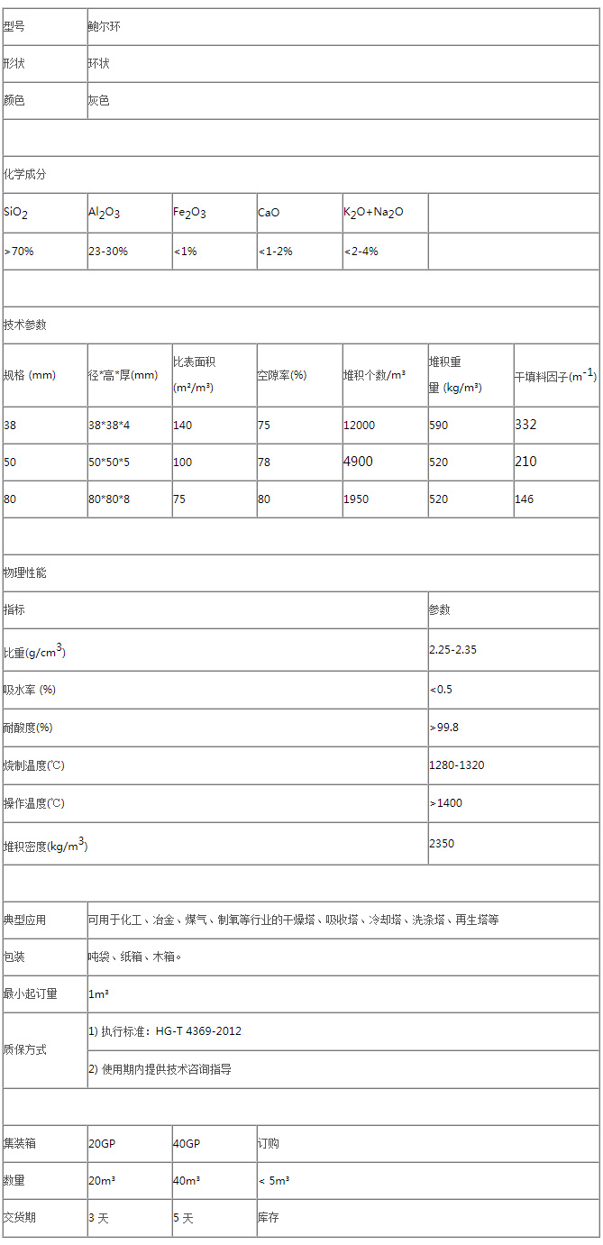 陶瓷鮑爾環(huán)填料是一種高徑相等的開(kāi)孔環(huán)型填料,每層窗孔有5個(gè)舌葉,每個(gè)舌葉內(nèi)彎指向環(huán)心,上下兩層窗孔的位置相反錯(cuò)開(kāi),一般開(kāi)孔面積約占環(huán)壁總面積的30%左右。